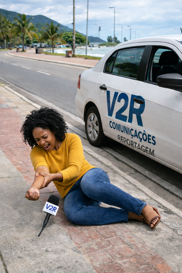 Ao chegar à avenida para registrar uma ocorrência de rotina, a jornalista abriu a porta do carro da equipe V2R e tentou sair em modo turbo — afinal, repórter que é repórter não perde tempo quando vê movimentação. O problema é que o chão tinha outros planos.